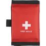 RPET 600D poliészterből készült elsősegélytasak tépőzárral és hordozópánttal. Tartalma: 5 sebtapasz, 1 steril fedőkötés, 1 nemszőtt törlőkendő, 8 alkoholos törlőkendő és 2 tisztítókendő. A külső felületen rPET címke található.