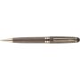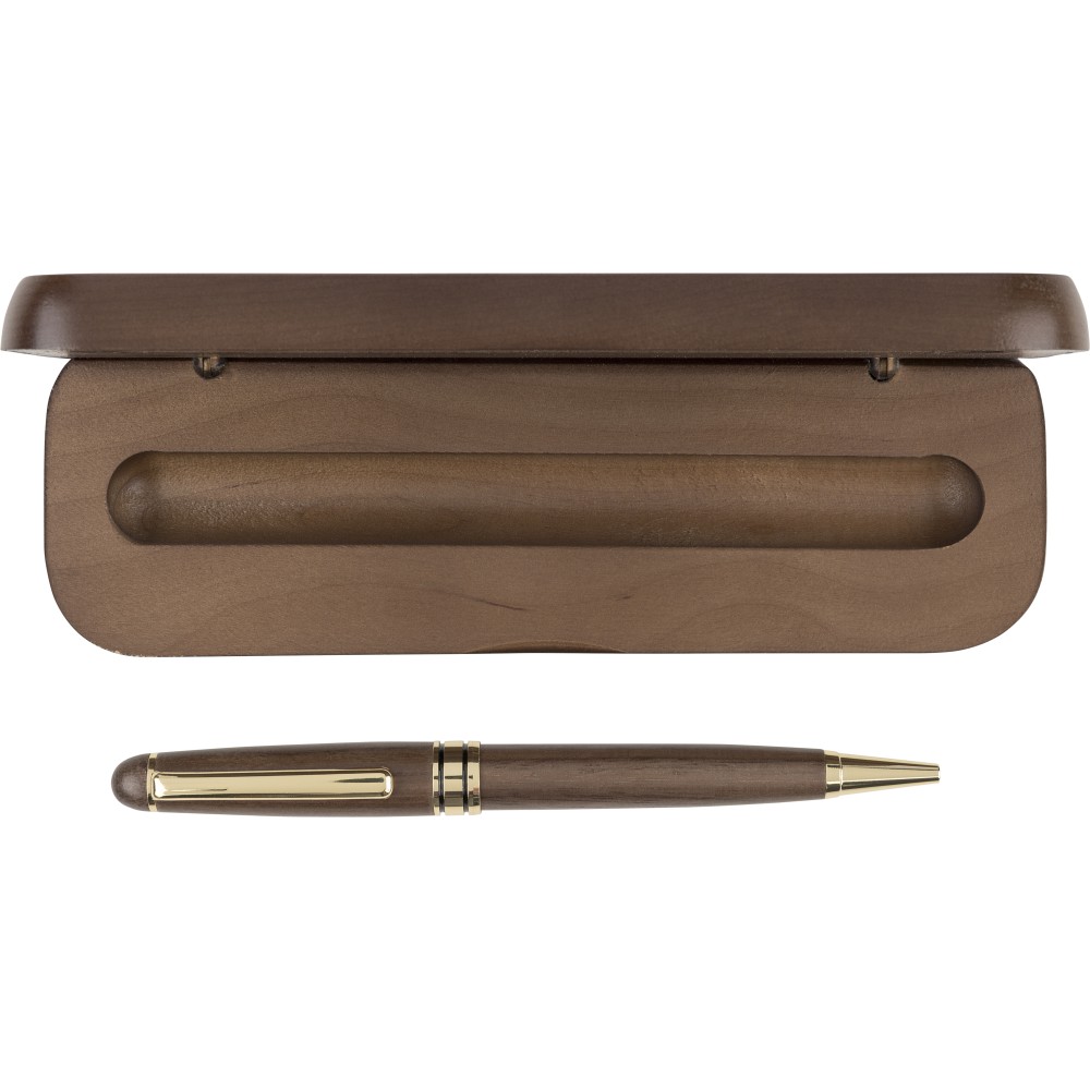 Diófából és rézből készült csavarós golyóstoll fém tollheggyel, klippel és díszítéssel, kék színű, német Dokumental tollbetéttel, megközelítőleg 1000 méter íráshosszúsággal. Juharfából készült dobozba és kartondobozba van csomagolva.