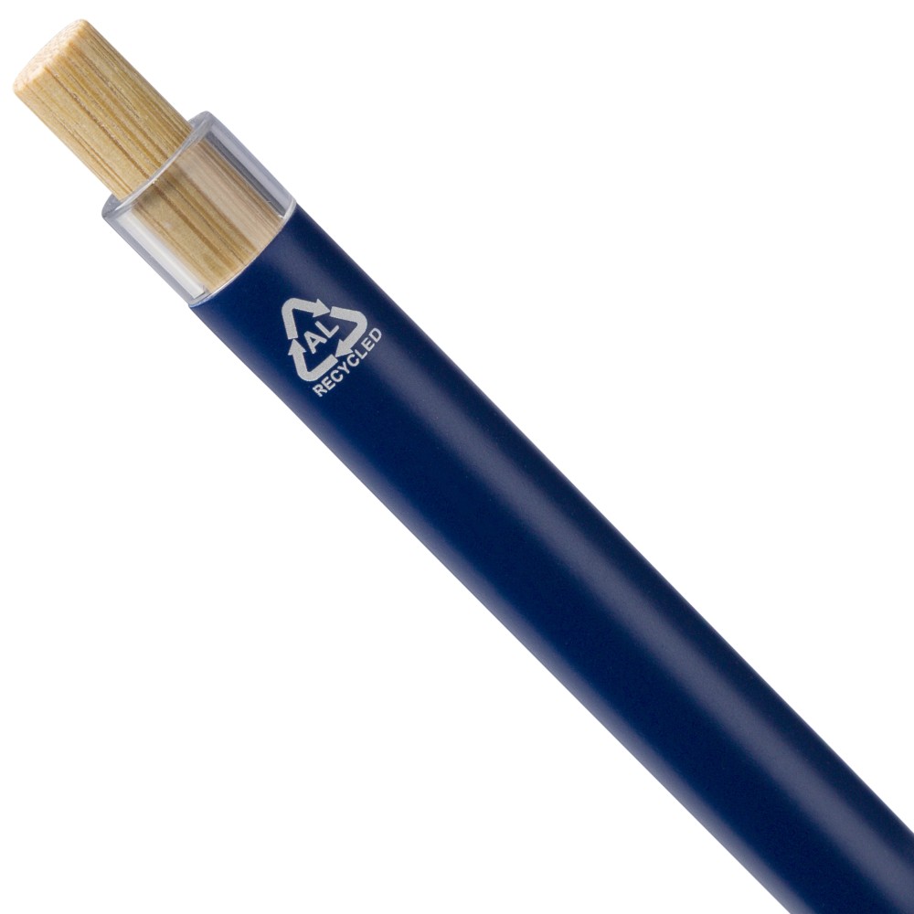 Újrahasznosított alumíniumból készült, lakkozott, nyomógombos golyóstoll bambusz nyomógombbal, rPET díszítéssel és fém klippel. A tolltesten gravírozott recycled (újrahasznosított) alapanyagra utaló logó található. Megközelítőleg 700 méter íráshossz, kék tollbetéttel.