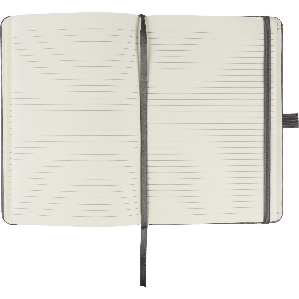 RPET 600D poliészterből készült, PU bevonatú, A5-ös jegyzetfüzet. 80 lap, 70 g/m2 vonalas papír, könyvjelző szalaggal, gumipánttal és tolltartó hurokkal. Félkemény borítású kialakítás. A hátoldalon dombornyomott recycled (újrahasznosított) alapanyagra utaló logó található.