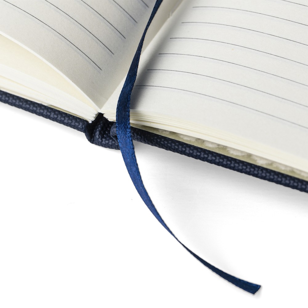 RPET 600D poliészterből készült, PU bevonatú, A5-ös jegyzetfüzet. 80 lap, 70 g/m2 vonalas papír, könyvjelző szalaggal, gumipánttal és tolltartó hurokkal. Félkemény borítású kialakítás. A hátoldalon dombornyomott recycled (újrahasznosított) alapanyagra utaló logó található.
