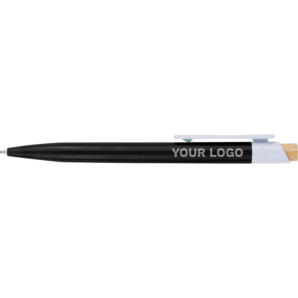 Újrahasznosított ABS-ből készült golyóstoll bambusz nyomógombbal és fehér klippel, digitális nyomtatásra alkalmas kivitelben. A tolltesten fröccsöntés során elhelyezett recycled (újrahasznosított) alapanyagra utaló logó található. Megközelítőleg 600 méter íráshosszúságú, kék színű tollbetéttel.