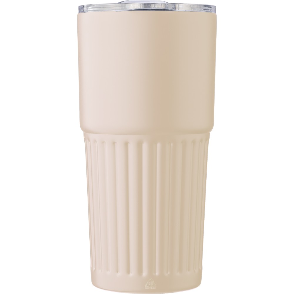 Újrahasznosított rozsdamentes acélból készült, duplafalú ivópohár (500 ml). Belső része 304-es, külső része 201-es rozsdamentes acél, bordázott fogófelülettel. AS fedéllel rendelkezik csúsztatható zárással. A palacktesten gravírozott recycled (újrahasznosított) alapanyagra utaló logó található. Darabonként barna kartondobozba csomagolva.