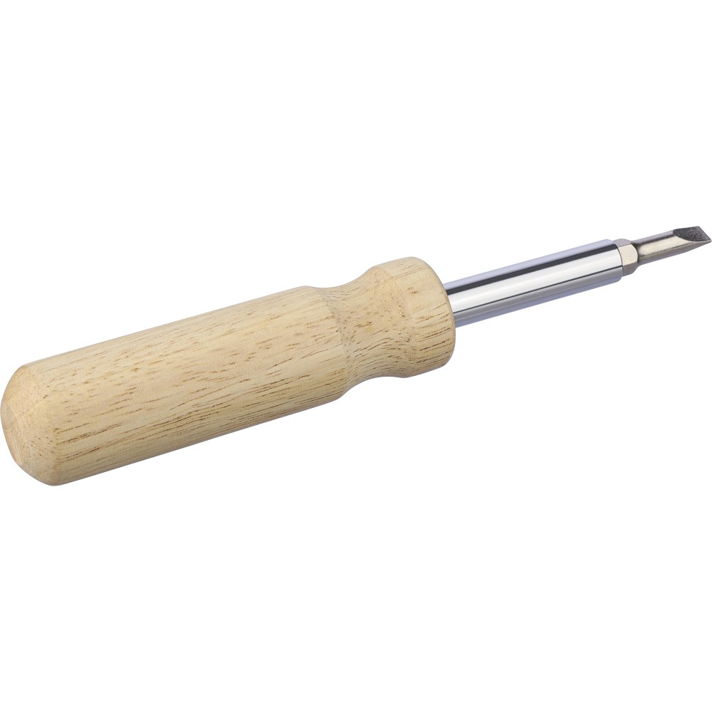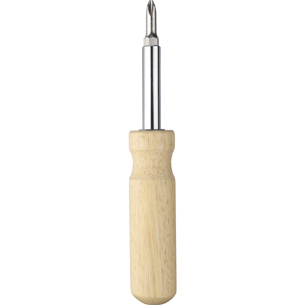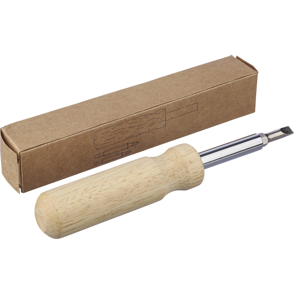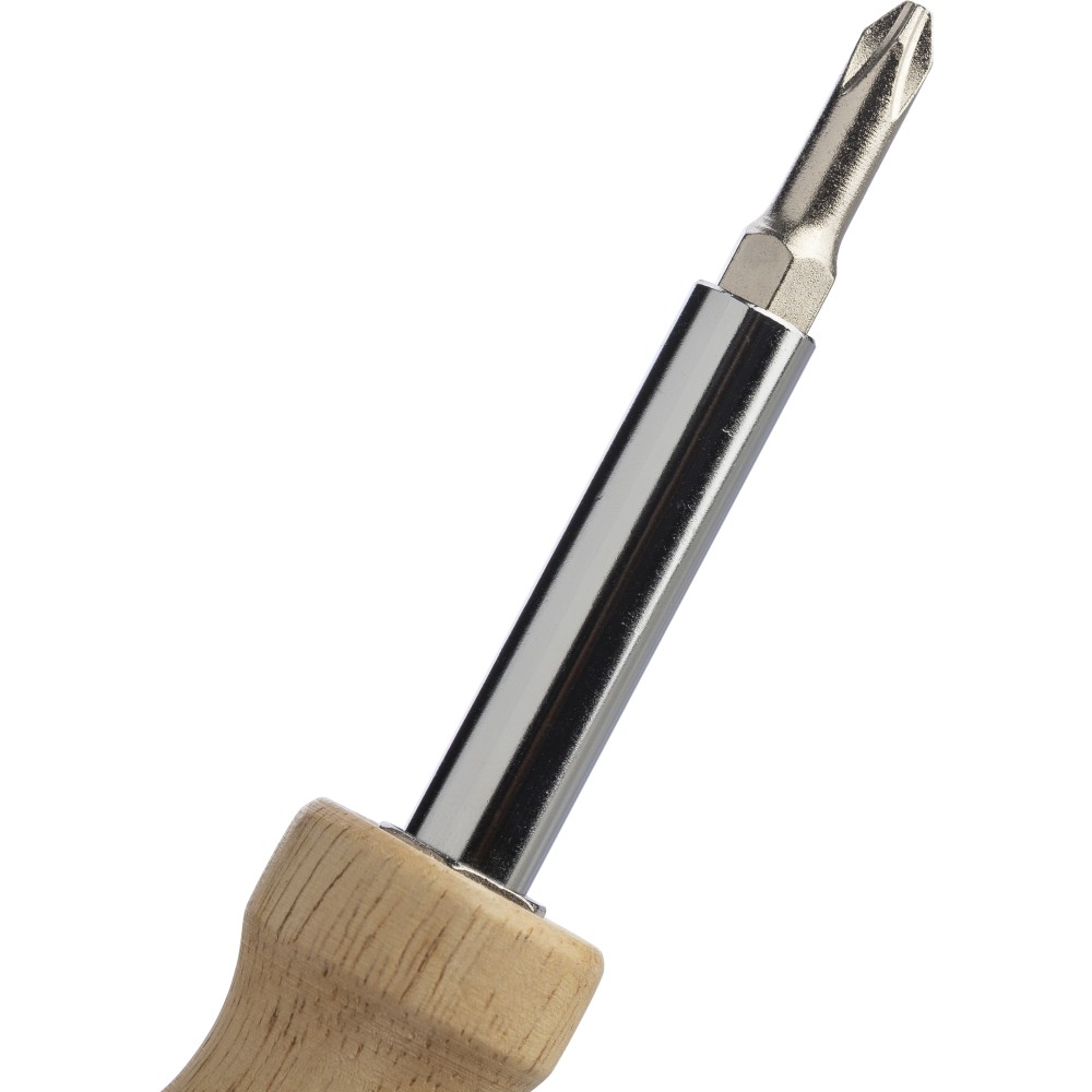 Kaucsukfa csavarhúzókészlet a nyélben tartható 4 db mágneses fejjel (2-2 db mindegyik kétoldalas hegyen). Praktikus és kompakt kialakítás cserélhető fejekkel és tartóval. Csomagolása barna papírdoboz.