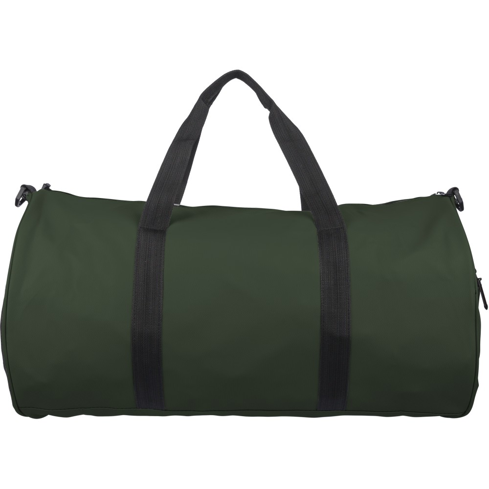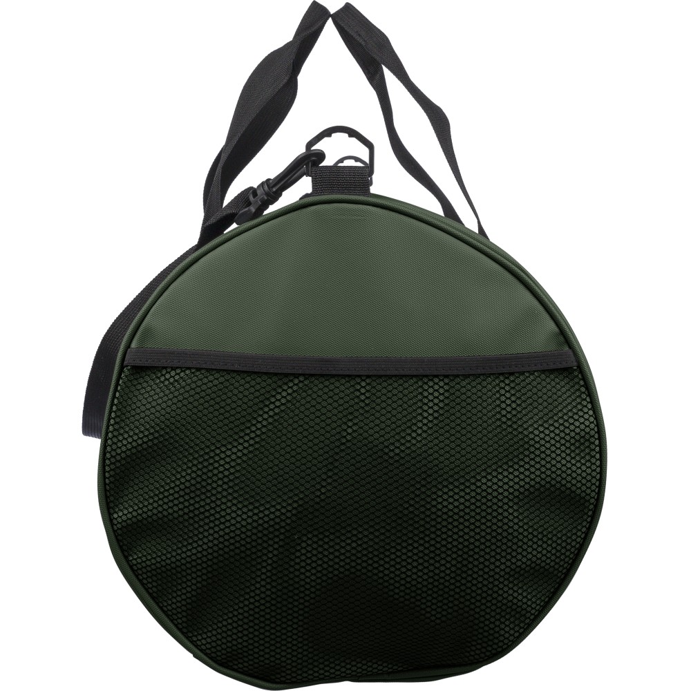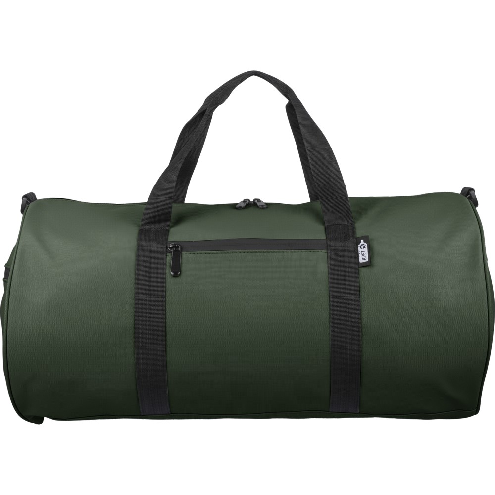 600D poliészterből készült rPET sporttáska 210D béléssel és vízlepergető PU bevonattal, 40 literes űrtartalommal. Elülső és oldalsó cipzáras zsebbel, hálós oldalzsebbel, két fogantyúval és állítható vállpánttal rendelkezik. Külső felületén rPET címkével ellátva.
